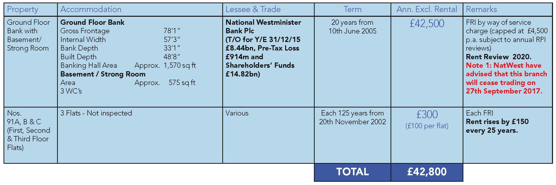 A substantial and attractive mid terraced building comprising a Ground Floor Banking Hall with internal access to a Basement / Strong Room and separate front access to 3 Self-Contained Flats on the first, second and third floors.