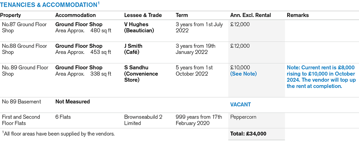 An attractive terraced property (No. 89 in Grade II Listed) comprising 3 Ground Floor Shops (refurbished in 2020) with a large front forecourt (25' deep), plus separate front access to Basement Storage, and a further separate front access to 6 Self-Contained Flats on the upper floors.