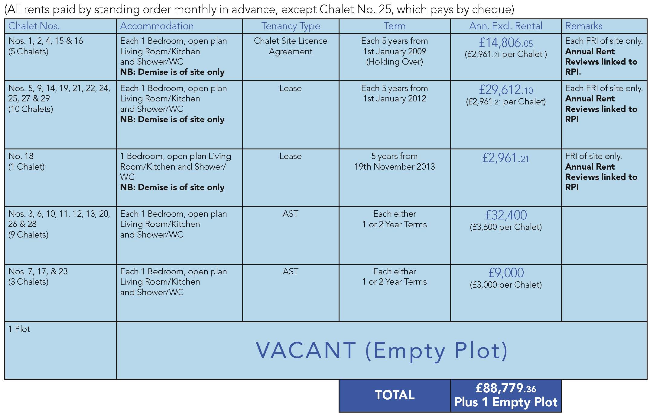Occupying a level trapezium shaped site (approx. 1.65 acres) with lawned areas, footpaths, roadway and car park for 18 vehicles and comprising 28 detached Chalets (each approx. 328 sq ft) plus one empty plot.