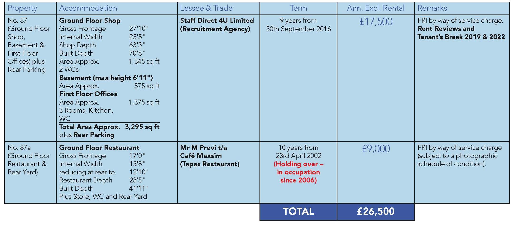 • No.87 comprises a Ground Floor Shop with Basement Storage and internal access to Offices, Kitchen & WC's across the entire first floor level.