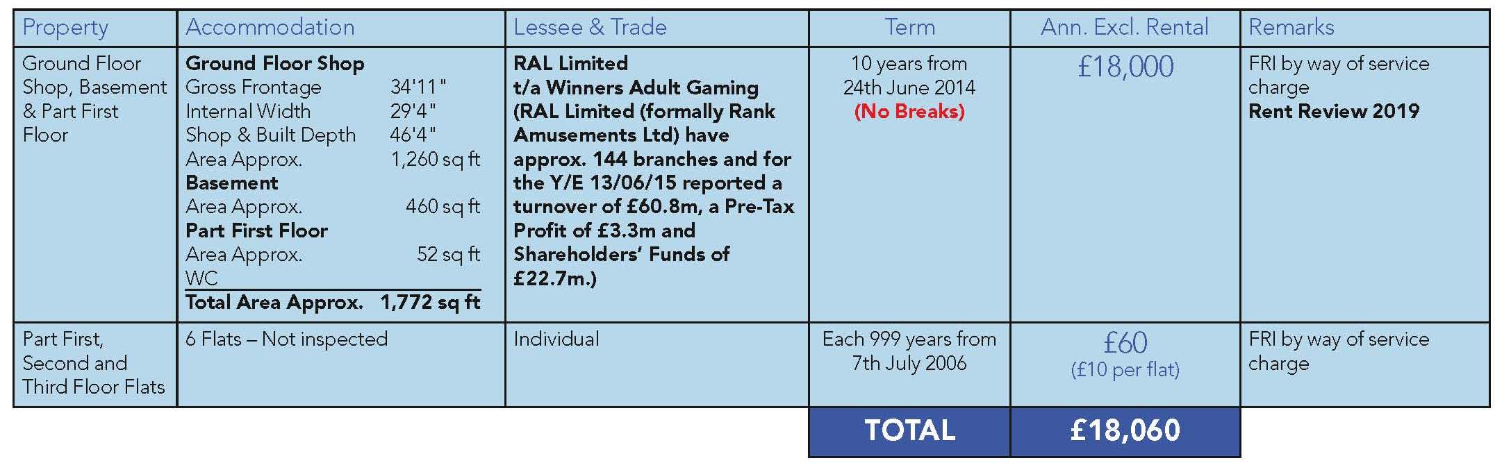 A mid terrace building comprising a Ground Floor Shop with Ancillary Storage in the basement and on part first floor. In addition, there is separate front access to 6 Self-Contained Flats on part first, second and third floors.