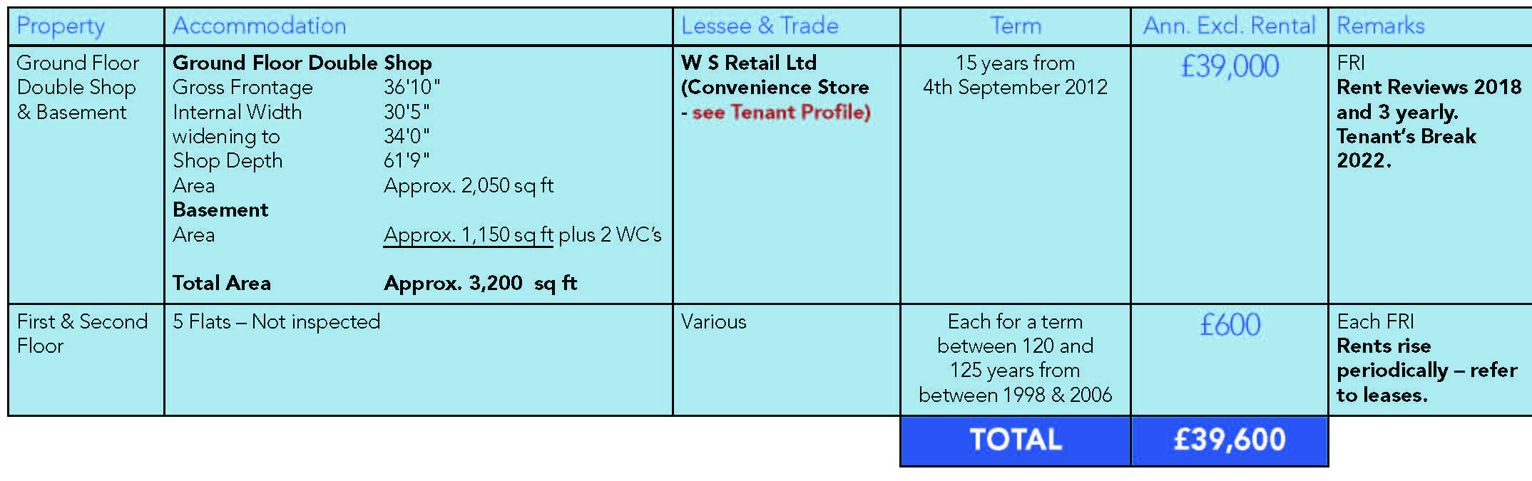 A mid terrace building comprising a Ground Floor Double Shop and Basement with separate front access to 5 Self-Contained Flats on the first and second floors.