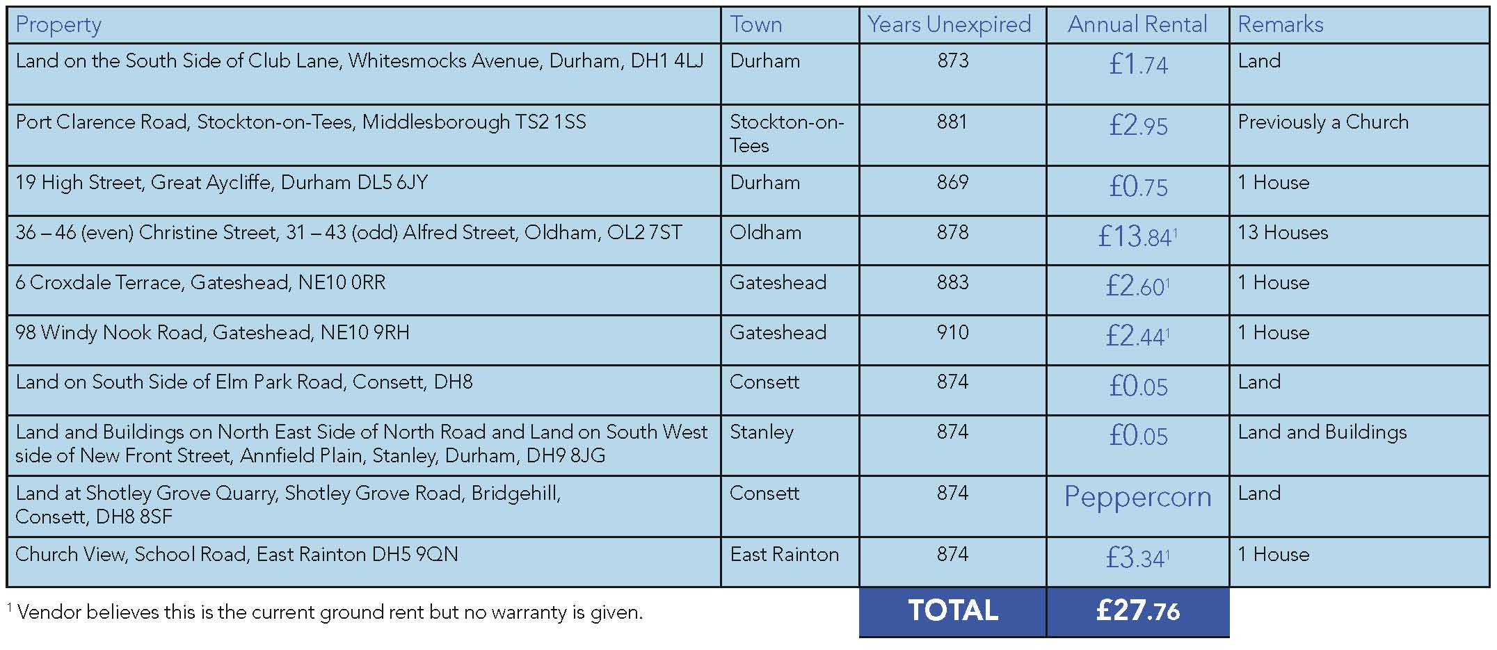 A portfolio of Ground Rents all let on 999 year leases, comprising of 17 Houses, Land and Buildings.
