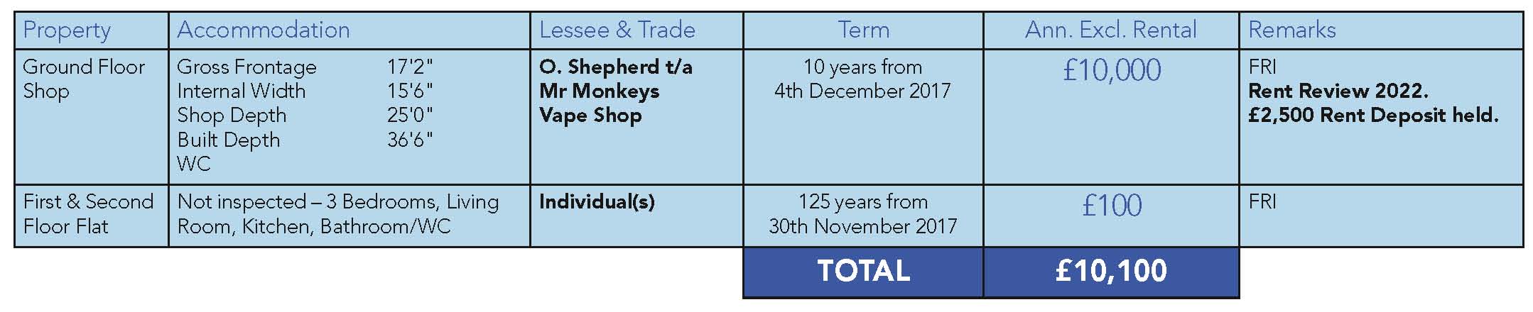 A mid-terraced building comprising a Ground Floor Shop with separate rear access to a Self-Contained Flat arranged over first and second floors. In addition, the property benefits from front lay-by parking, a rear service road for unloading and a Rear Yard.