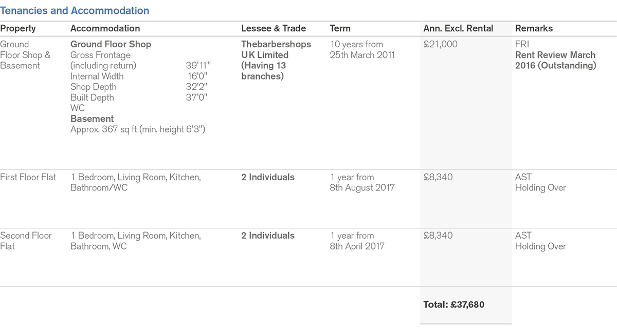 A Grade II Listed corner building comprising a Ground Floor Barber Shop and Basement with separate side access to 2 Self-Contained Flats at first and second floor level.