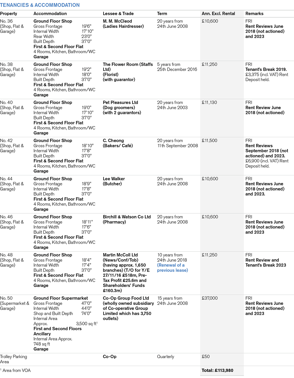 An unbroken detached block on a rectangular corner site erected in the 1970's comprising 7 Ground Floor Shops with two separate rear staircases to 7 Self-Contained Flats on two upper floors. In addition, No. 50 comprises a Supermarket with two floors above for ancillary use. There is also a front and side shopper's car park and rear yard for loading/unloading and a block of 8 Garages. Nearly all of the upper part windows are in uPVC.