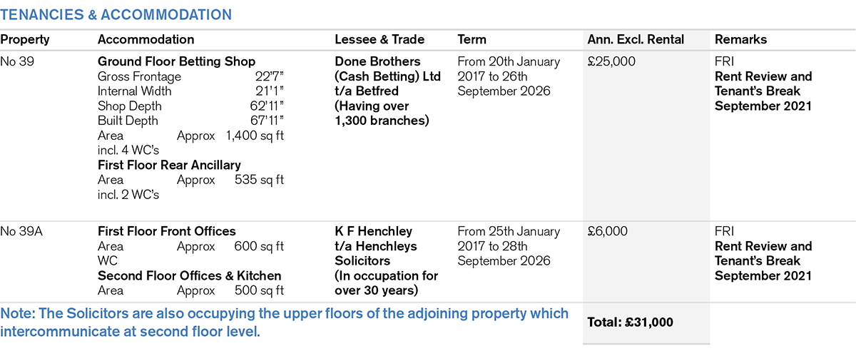 A corner building comprising a deep Ground Floor Betting Shop with Ancillary Accommodation at rear first floor level plus separate side access to a Self-Contained Solicitor's Office at front first floor level and the entire second floor.