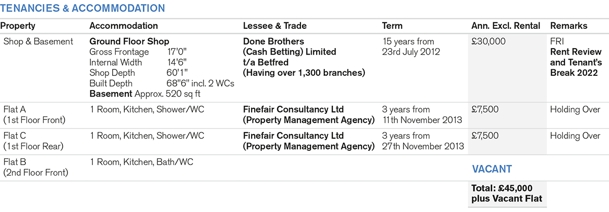 A corner building comprising a Ground Floor Betting Shop and Basement with separate front and side access to 3 Self-Contained Flats on first and second floor levels (see Note).