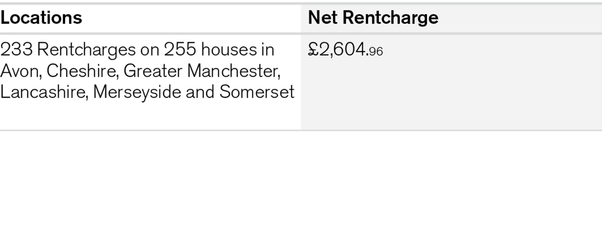 A portfolio of 233 Rentcharges on 255 houses in various locations throughout Avon, Cheshire, Greater Manchester, Lancashire, Merseyside and Somerset.