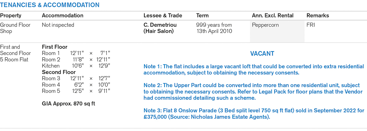 A mid-terraced building comprising a Ground Floor Shop (sold-off) with two separate entrances from the rear accessed via a service road to a 5 Room Self-Contained Flat on the first and second floors. In addition, the flat benefits from a roof terrace (11'11" × 12'8") at first floor level.
