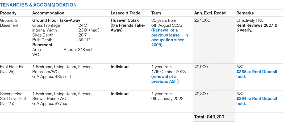 A mid-terrace building comprising a Ground Floor Take-Away and Basement with separate front access to 2 Self-Contained Flats on first and second floors.