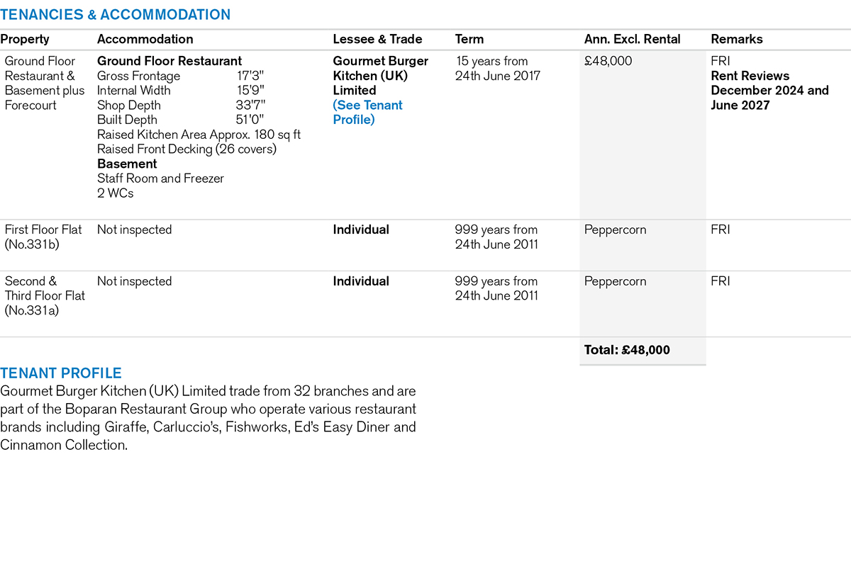 A mid terrace building comprising a Ground Floor Restaurant benefitting from a Large Front Forecourt used for external seating together with a Basement. In addition, there is separate rear access to 2 Self-Contained Flats at first, second and third floor levels.