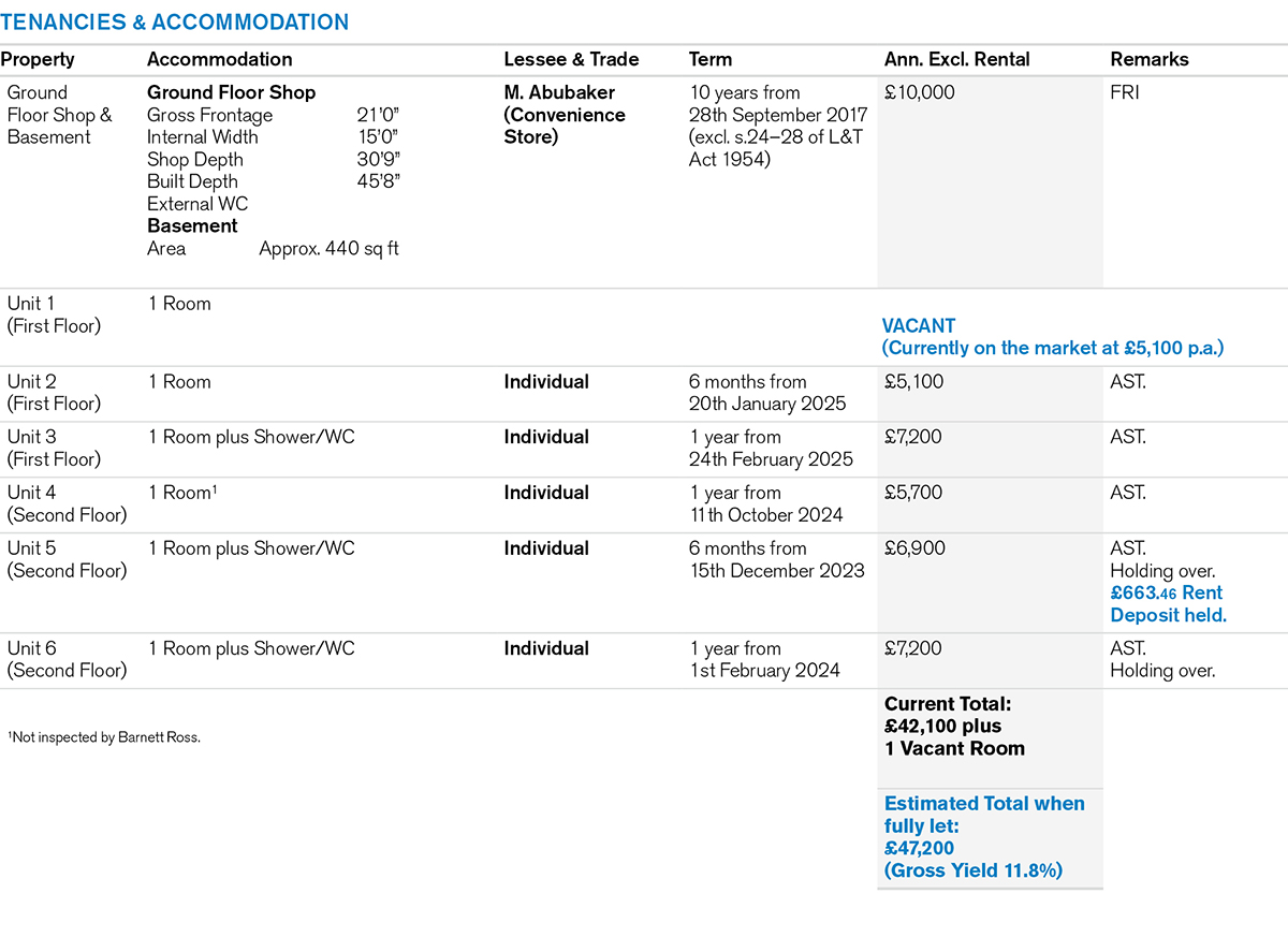 A mid-terrace building comprising a Ground Floor Shop and Basement with separate front access to 6 HMO Units on the first and second floors.