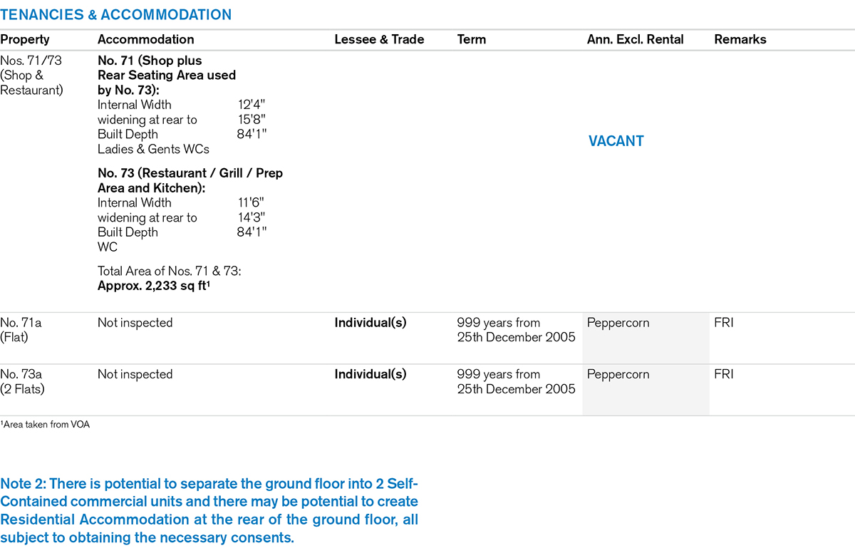 - A Ground Floor Restaurant (No. 73) which interconnects with the rear of No. 71 to access the seating area (approx. 65 covers).