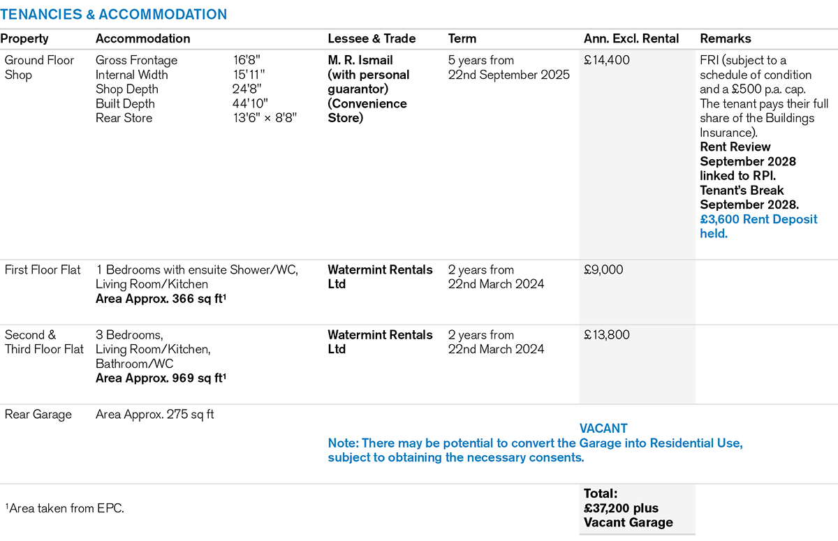 A mid-terrace building comprising a Ground Floor Shop with separate rear access via Dental Street to a Rear Garage (see Note) and 2 Self-Contained Flats on the first, second and third floors.