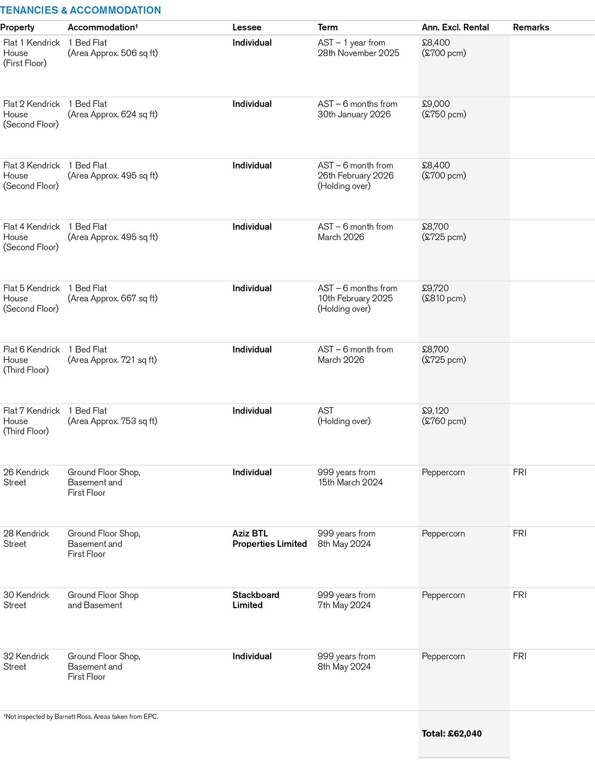 - 7 × 1 Bed Flats (each let on ASTs) on part first, second and third floors accessed from Kendrick Lane.